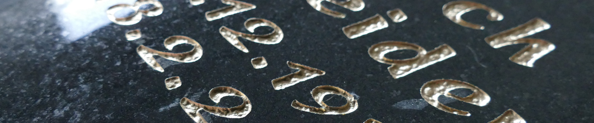 Eine Grabbuch-Beschriftung wird entweder in den Stein graviert (hochwertige Sandstrahlgravur), geschlagen oder als Metallschriftzug aufgesetzt. Bei der ersten Variante erstellt der Steinmetz eine Sandstrahlgravur Ihrer Inschrift, die 2-3 mm tief in den Stein eingearbeitet und anschließend mit Ihrer Wunschfarbe ausgelegt wird.